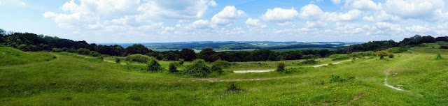 Looking down the central swath to the bowl below and back to the carpark in the distance, as well as up tot eh top of the ridgeline and the two most obvious of the four devil's humps - bronze age burial mounds.