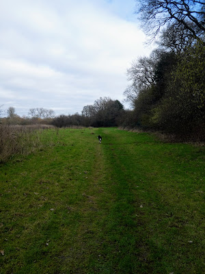 Alongside the canal on a towpath between it and the river, initially narrow and