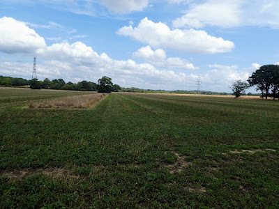 The track came out of the copse beside a lake - man made - tightly fenced off. We went around the lake and over the end before climbing up a harvested field beyond.