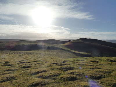 The next summit was across a small valley with lots of dead bracken hiding all the paths. We had to try and follow sheep paths buried underneath. The climb up the slope used an excess of energy.