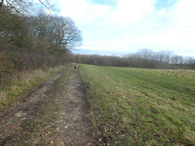 At the farm buildings we turned down a track going south, and past a barn this turned into a path along side a field and through a small wood. Then we followed a dog leg in the next field to take us slightly east.