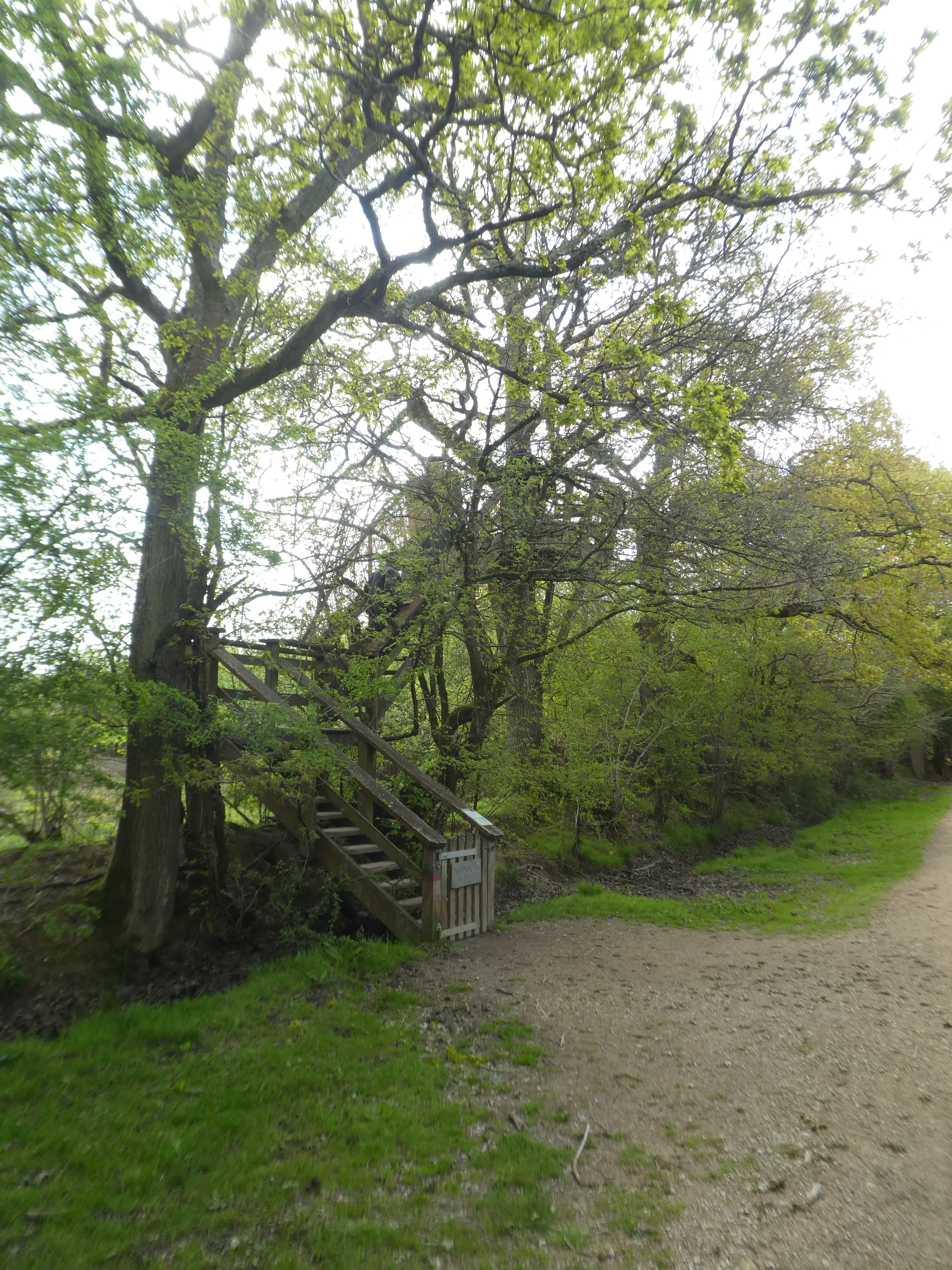Down the wide lane down the side of the estate, passing the first tree lookout. Two stags crossed the path ahead, but all I got was bushes on the camera.