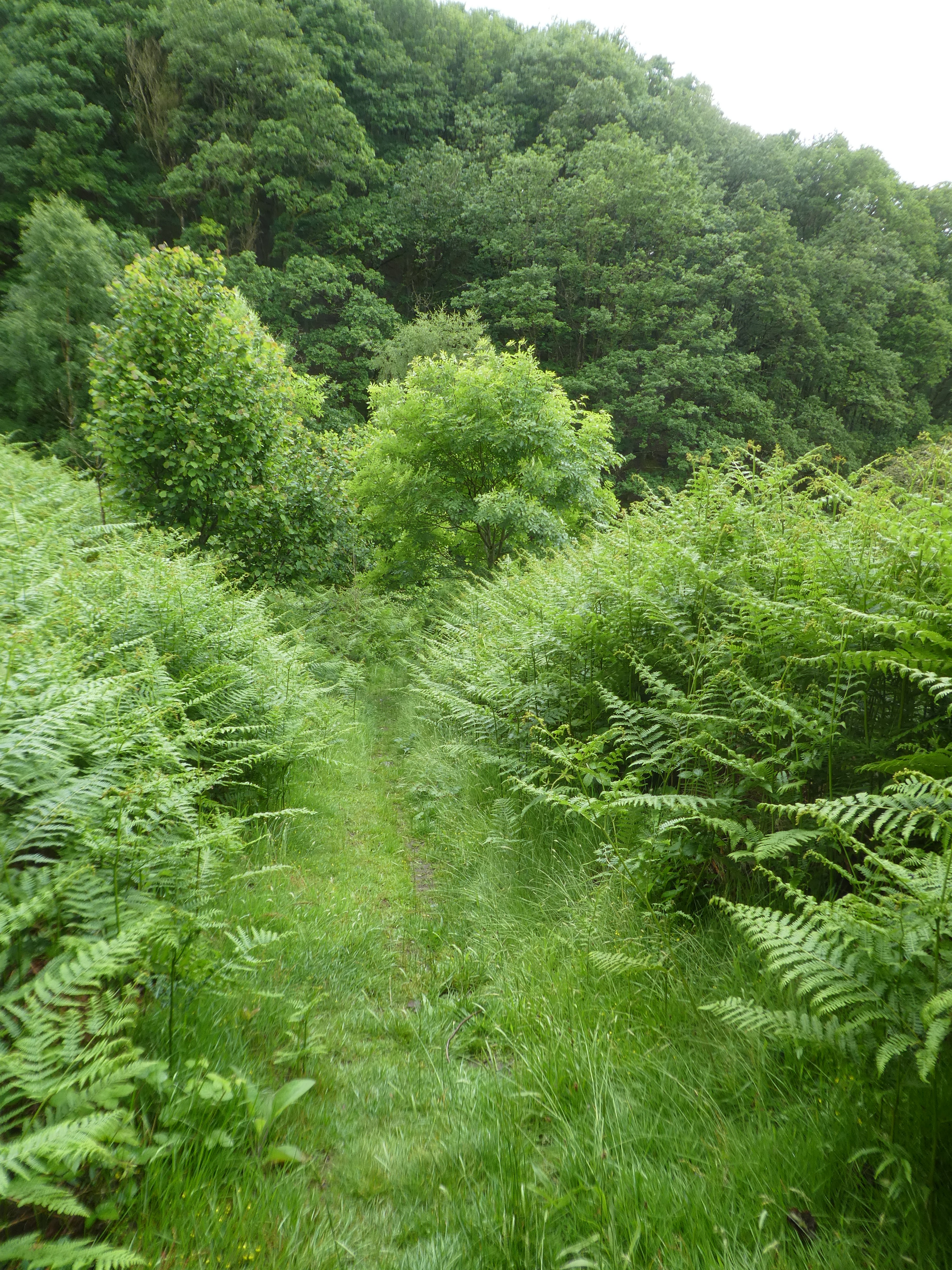 Along the top of the tree line on a slope covered in bracken - luckily there was a quad bike track to follow, which then changed into a green track as it curved around in the trees.