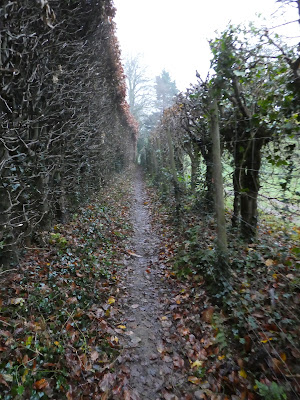Into Milton Wood on an undulating path on the slope above the river. The path ended at a large house where it merged into the driveway.