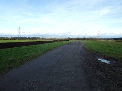 The track curved around Crawfold farm (more industrial estate than farm). Over the fish ponds and climbing the fallow field beyond towards Sladelands. Over the ridge and across a ploughed field - it was a good job I knew where the path went! Then over grass lane and through a sheep field.
