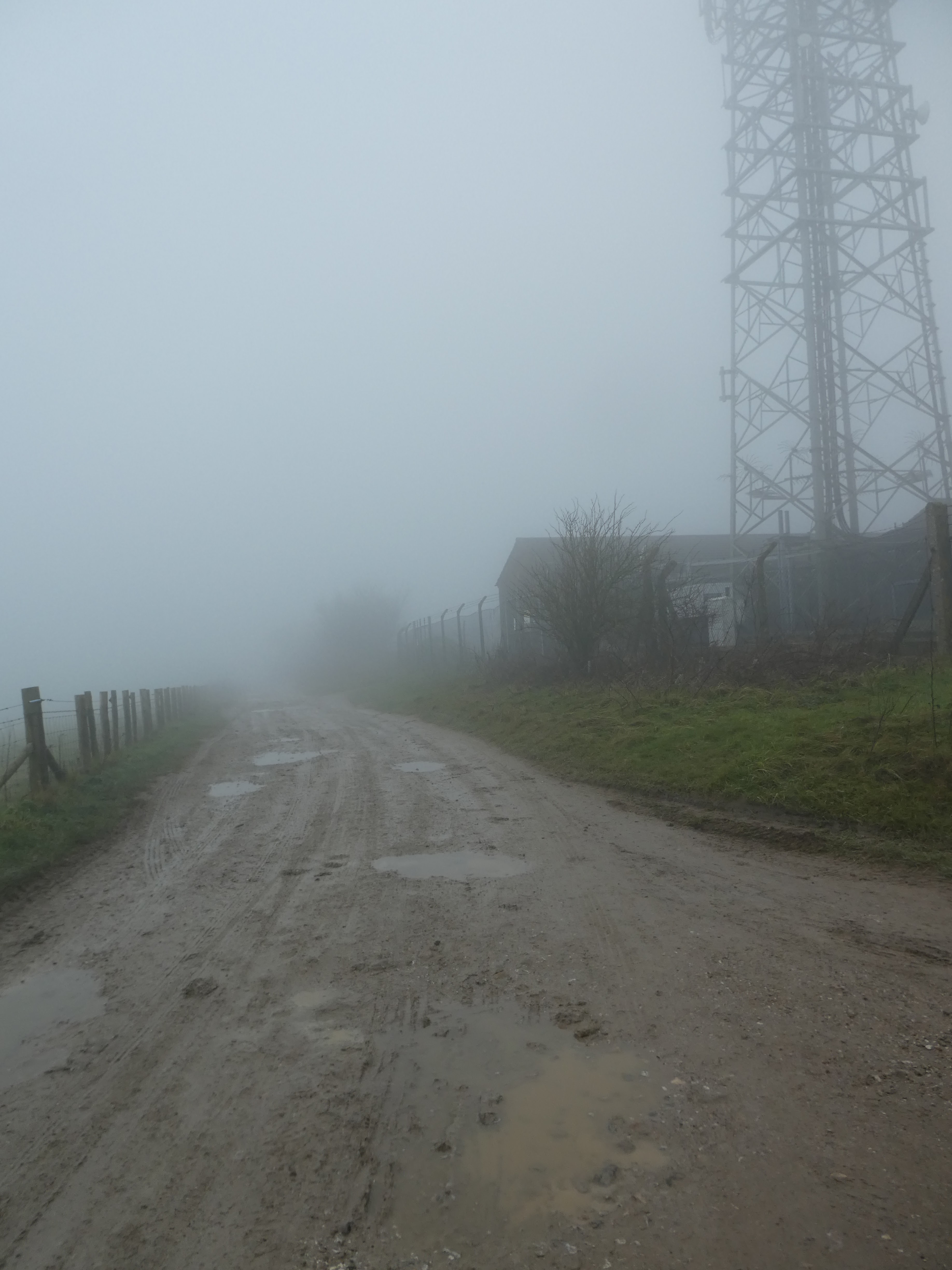 The path was muddy, but not completely churned up. Beyond the woods it opened up so the downs were just visible in the mist.