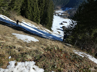 The track continued around climbing slightly to a meadow with some barns in it. We had been warned by a skier descending that the snow on the righthand side of the bowl to the summit was not good and that we should go up the left.... this would prove to be stretching it a little. We would find out later that the right-hand side was a gentler climb and although it was missing some snow it was generally workable. Our side was steeper, and shorter, however was softened by the morning sun and we had to climb up in corn snow. this proved hard work.